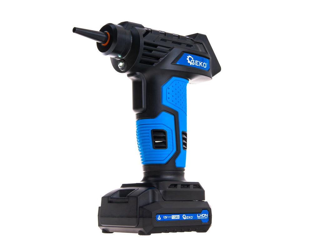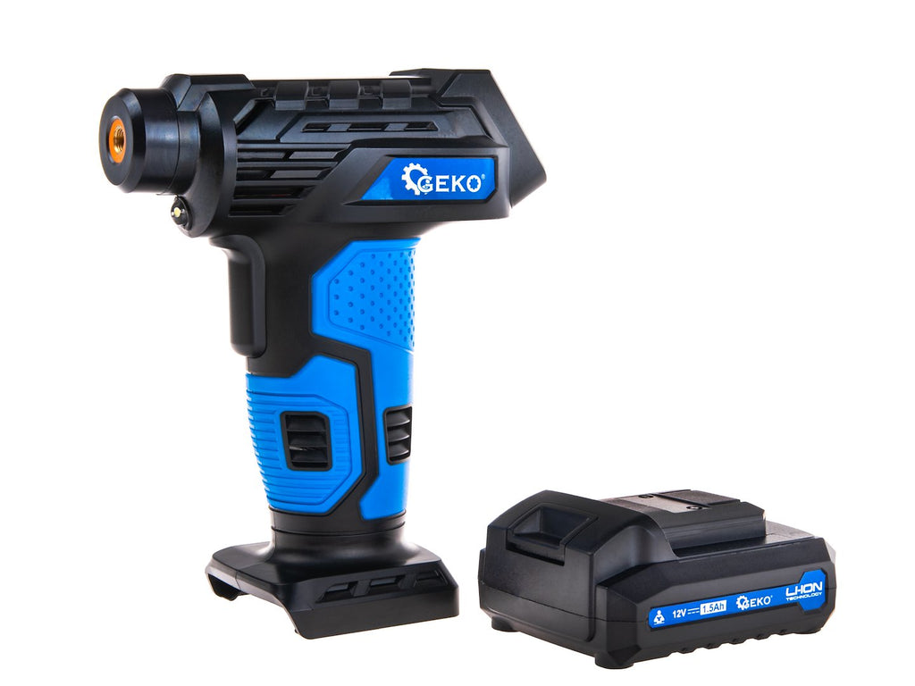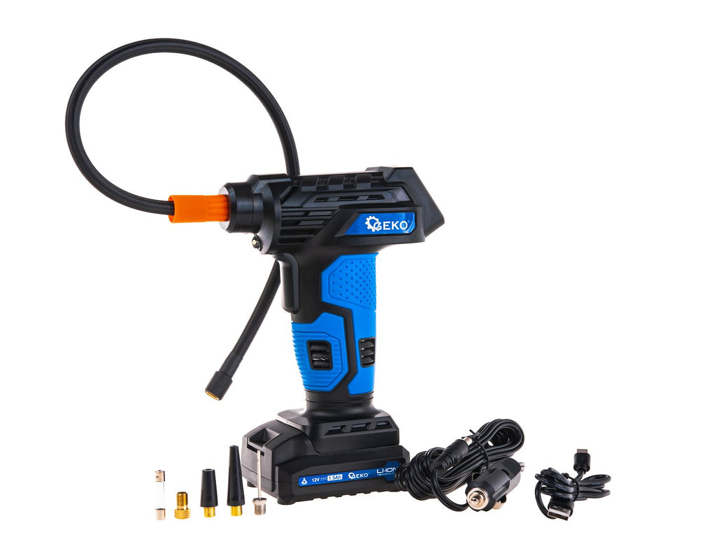 Ο Aεροσυμπιεστής Φορητός Με Μπαταρίας 12V Με Οθόνη LCD GEKO είναι μια ασύρματη συσκευή, τροφοδοτούμενη από μπαταρία Li-ion 12V 1,5Ah, ιδανική για το φούσκωμα ελαστικών, μπαλών και φουσκωτών στρωμάτων. Διαθέτει ψηφιακή οθόνη για χειροκίνητη ρύθμιση της πίεσης και τέσσερις προεπιλεγμένες λειτουργίες για αυτοκίνητα, μοτοσικλέτες, ποδήλατα και μπάλες. Η μέγιστη πίεση λειτουργίας είναι 10,3 bar (150 psi), η παροχή αέρα είναι 23 l/min και η διάμετρος του κυλίνδρου 21 mm.