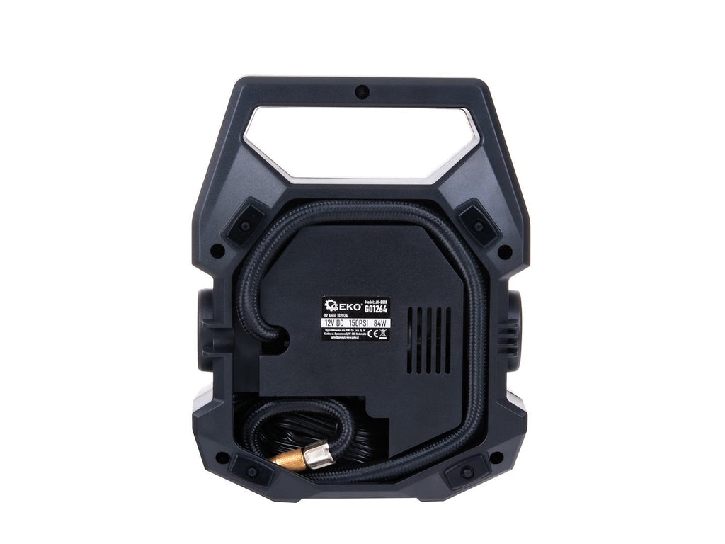 Ο συμπιεστής λειτουργεί με μέγιστη πίεση 10 bar (150 psi, 1100 kPa, 11 kg/cm²). Η οθόνη υποστηρίζει πολλαπλές μονάδες μέτρησης, όπως bar, psi, kPa και kg/cm². Τροφοδοτείται απευθείας από την υποδοχή αναπτήρα του αυτοκινήτου και διαθέτει σωλήνα αέρα μήκους 45 cm. Περιλαμβάνει επίσης κωνικά ακροφύσια 5-12 mm και 7.7-12 mm. Με συμπαγείς διαστάσεις 190 x 140 x 65 mm, είναι εύκολος στη μεταφορά και αποθήκευση. Η ισχύς του είναι 84W και λειτουργεί στα 12V.