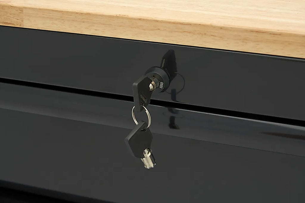 Το ντουλάπι είναι εξοπλισμένο με 4 ρόδες, εκ των οποίων οι 2 είναι περιστρεφόμενες με φρένο και οι 2 σταθερές, για ευκολία μετακίνησης και σταθερότητα. Διαθέτει επίσης κλειδαριά για την ασφάλεια των εργαλείων. Το προϊόν δεν διαθέτει πόρτα, δεν είναι εξοπλισμένο με πρόσθετα εξαρτήματα και δεν περιλαμβάνει κάδο απορριμμάτων.