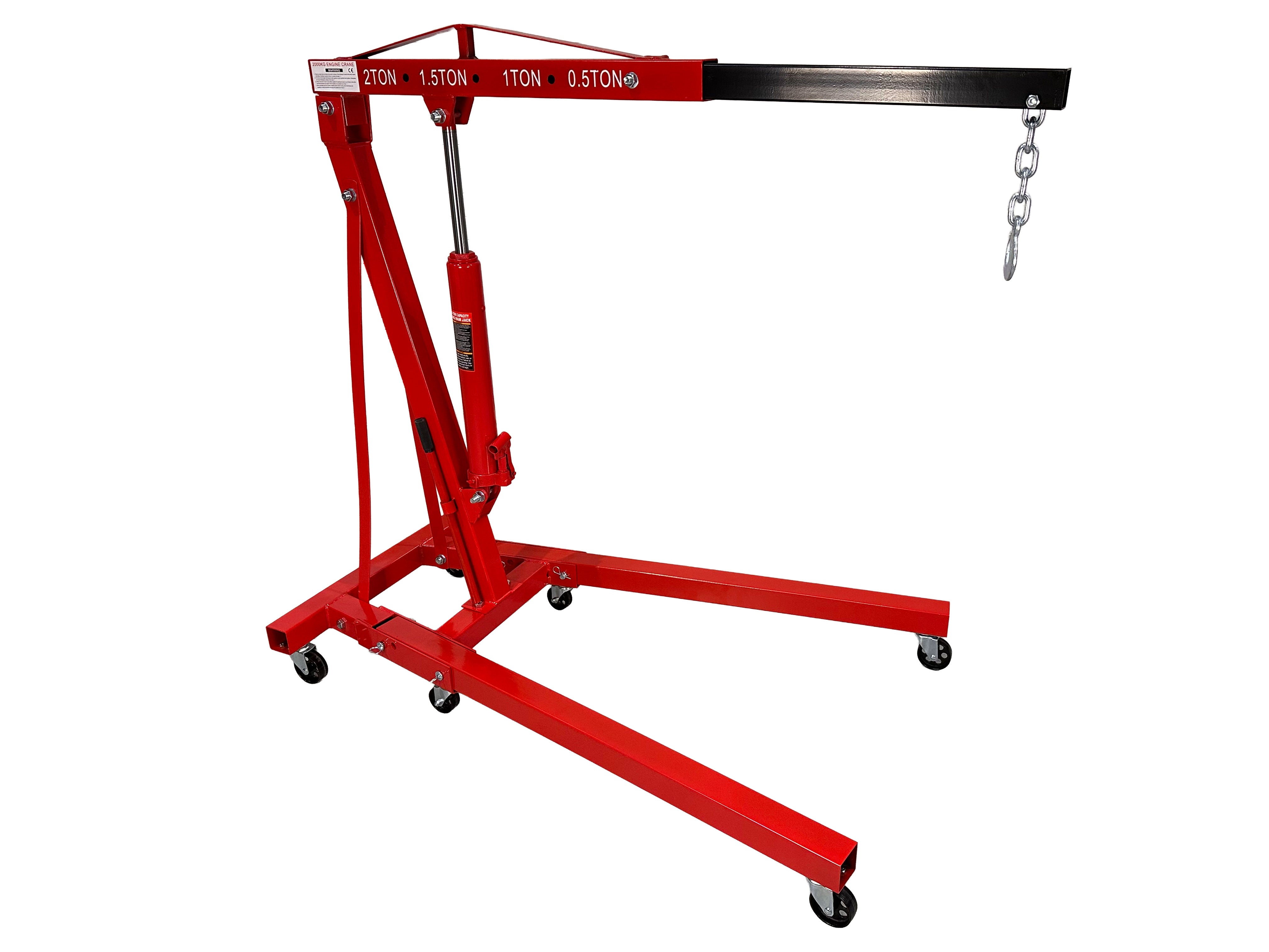 Το Γερανάκι Ανύψωσης Κινητήρων Υδραυλικό 2T είναι κατασκευασμένο από κλειστά προφίλ πάχους 3 mm και έχει μέγιστη ικανότητα ανύψωσης 2 τόνων. Ο βραχίονας είναι ρυθμιζόμενος σε τέσσερα επίπεδα, που αντιστοιχούν σε ικανότητες φορτίου 500 kg, 1 τόνο, 1,5 τόνους και 2 τόνους, ανάλογα με τη θέση επιλογής.