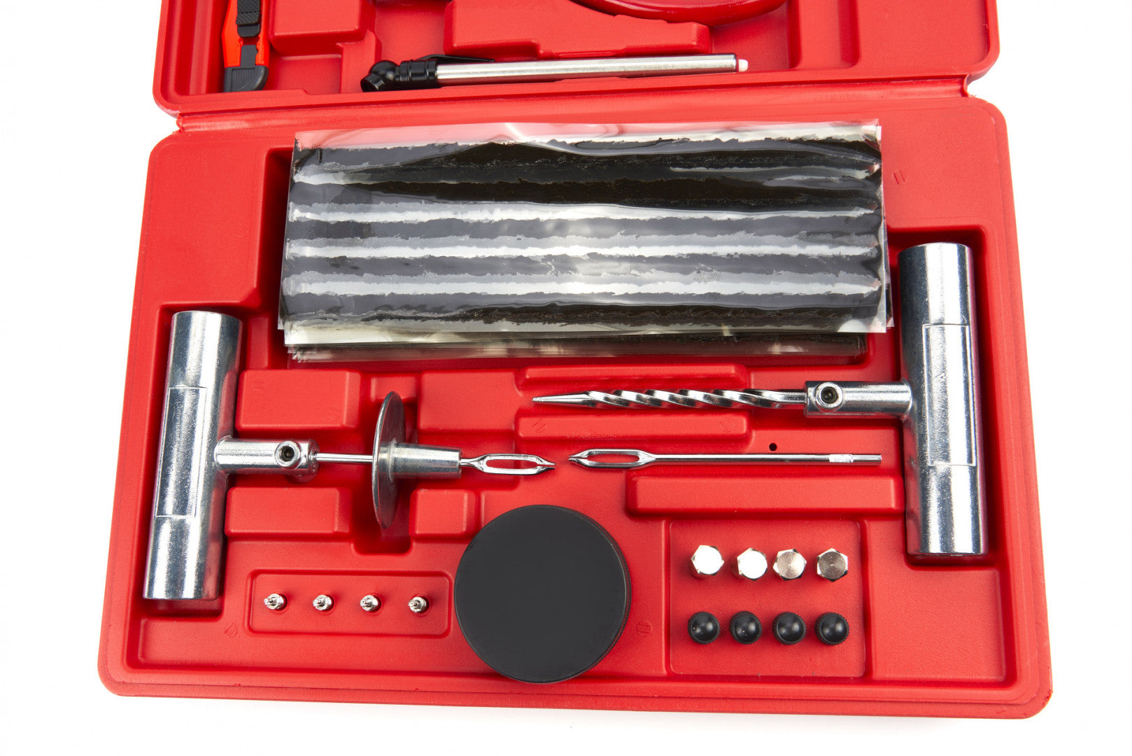 Με αυτό το Κιτ Επισκευής Ελαστικών 64 Τμχ HBM θα αποκτήσετε όλα όσα χρειάζεστε για να επισκευάσετε τα ελαστικά αυτοκινήτων και μοτοσικλετών με απλό τρόπο. Με τον όρο επισκευή εννοούμε τη συμπλήρωση των οπών του ελαστικού από το εσωτερικό. Το σετ περιλαμβάνει δύο χειροκίνητα τρυπάνια για την προετοιμασία και την πλήρωση της κατεστραμμένης περιοχής με το αυτο-βουλκανιζόμενο καουτσούκ που παρέχεται.