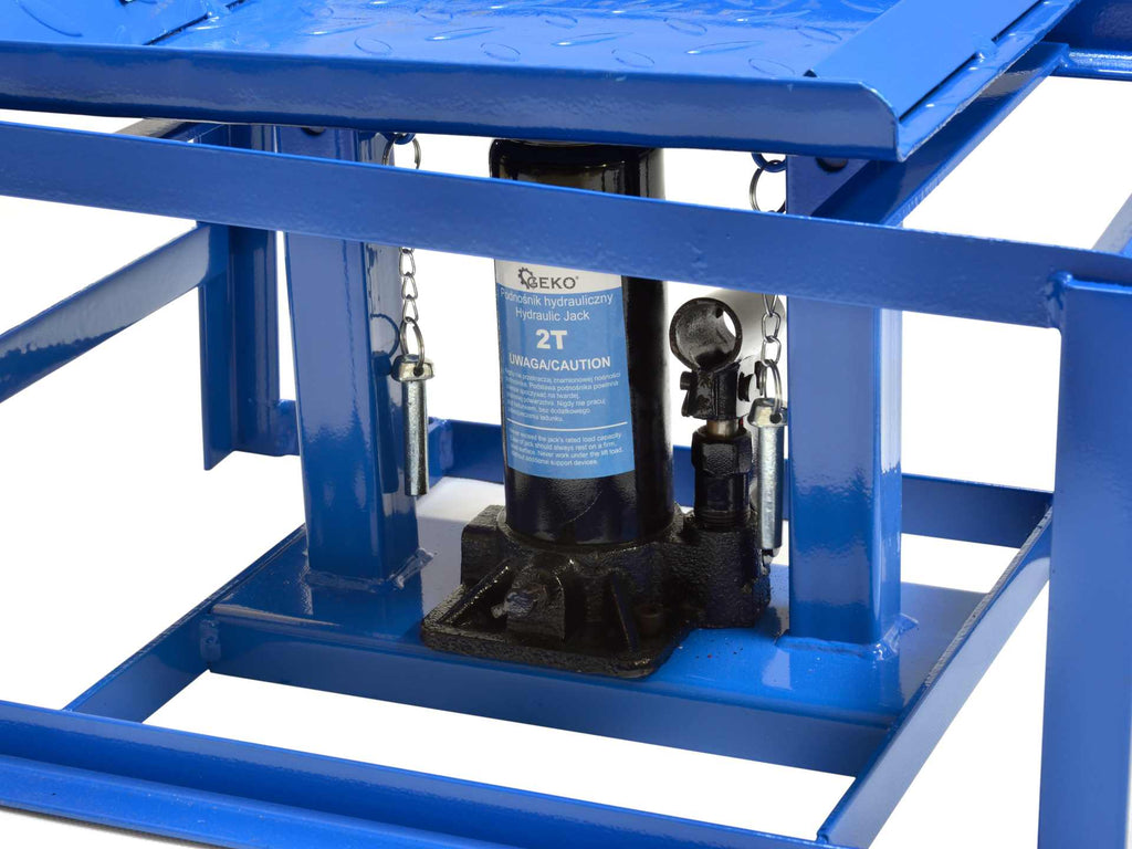 Η Υδραυλική Ράμπα Αυτοκινήτου 2Τ GEKO προορίζεται για οχήματα με βάρος έως 2000 kg και είναι εξοπλισμένη με ενσωματωμένο υδραυλικό γρύλο με βαλβίδα ασφαλείας κατά της υπερφόρτωσης. Διαθέτει τέσσερις θέσεις κλειδώματος ύψους και βίδα ασφαλείας για τη στερέωση του ανυψωμένου οχήματος.
