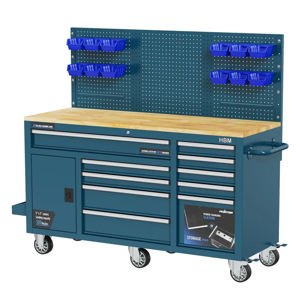 Αυτός ο ΠΑΓΚΟΣ - ΝΤΟΥΛΑΠΑ ΕΡΓΑΛΕΙΩΝ ΜΕ ΠΙΝΑΚΑ & ΜΑΣΙΦ ΞΥΛΙΝΟ ΠΑΓΚΟ 158 CM HBM ΜΠΛΕ είναι ιδανικός τόσο για εργασία όσο και για αποθήκευση εργαλείων. Είναι εύκολα μετακινήσιμος χάρη στους τροχούς του, εκ των οποίων οι 4 είναι περιστρεφόμενοι και οι 2 διαθέτουν φρένα, καθώς και στη στιβαρή χαλύβδινη λαβή του. Η επιφάνεια εργασίας είναι κατασκευασμένη από μασίφ ξύλο πάχους 3 cm. Επιπλέον, διαθέτει πολλά συρτάρια αποθήκευσης, τα οποία μπορούν να ασφαλιστούν ξεχωριστά. Στην αριστερή πλευρά περιλαμβάνει 3 μεγάλα συρτάρια με διπλούς οδηγούς, ενώ συνολικά διαθέτει 12 συρτάρια αποθήκευσης.