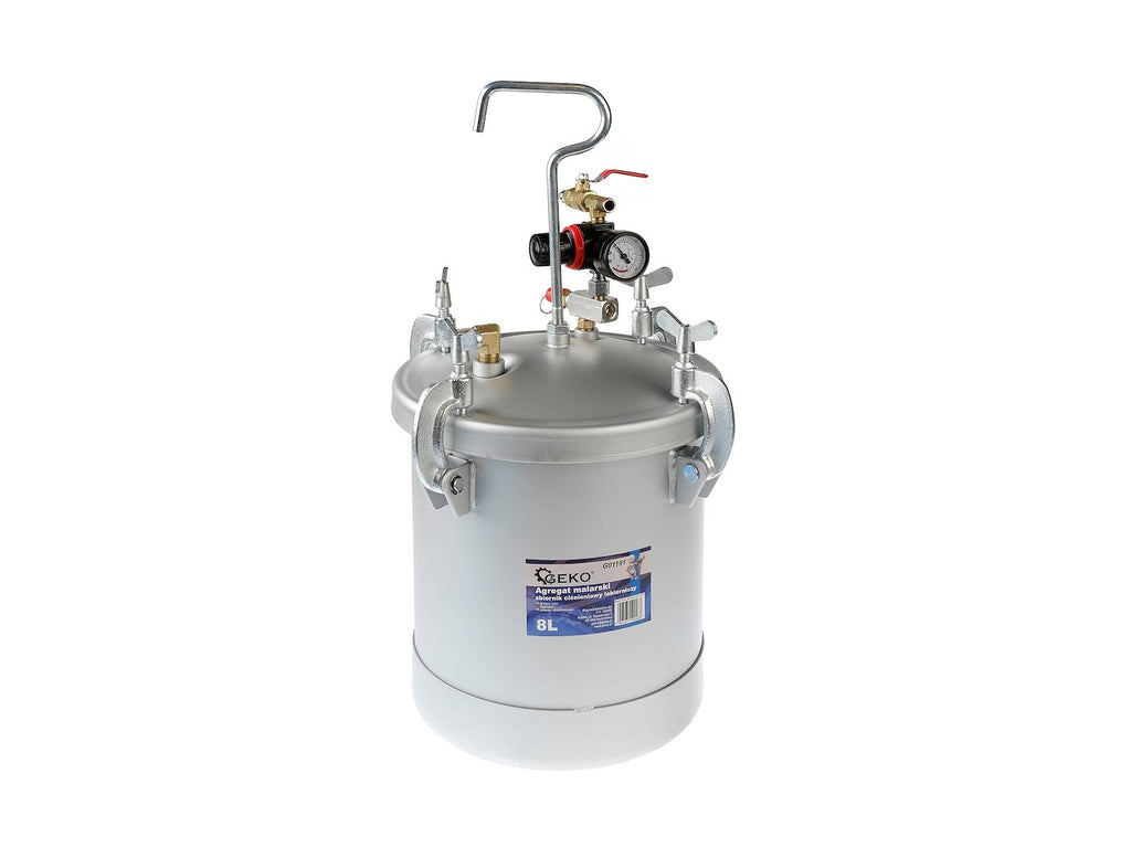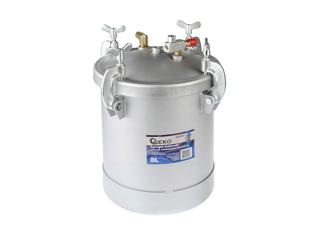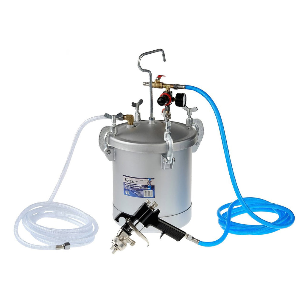 Το δοχείο 8 λίτρων είναι κατασκευασμένο από ατσάλι με επίστρωση Dacromet, που προσφέρει υψηλή αντοχή στη διάβρωση και προστασία από χημικές και μηχανικές φθορές. Η πίεση λειτουργίας του ρυθμίζεται μεταξύ 1.7 και 3.0 bar, ενώ περιλαμβάνει ρυθμιστή πίεσης με ένδειξη 0–12 bar, βαλβίδα ασφαλείας, υποδοχή αέρα 1/4" με βάνα και υποδοχή 3/8" για την παροχή υλικού στο πιστόλι.