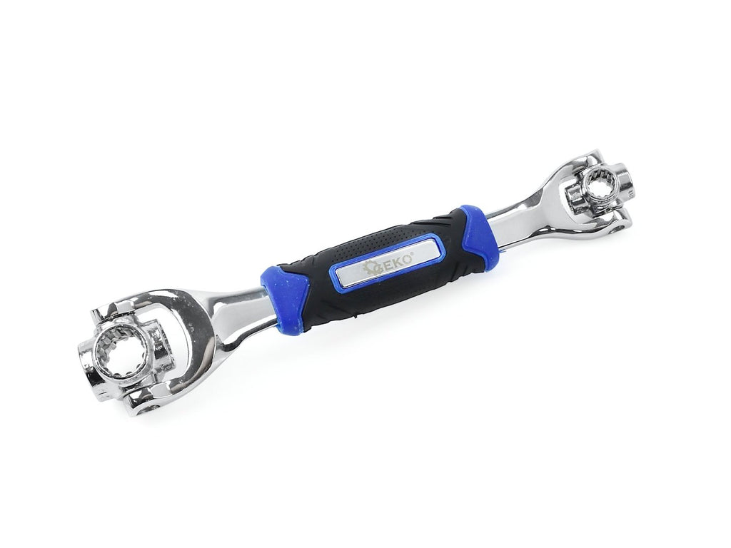 Το Πολυμορφικό Κλειδί Πολυεργαλείο 48 Σε 1 Με Περιστρεφόμενη Κεφαλή 360° CRV Universal είναι ένα ευέλικτο εργαλείο κατασκευασμένο από ανθεκτικό ατσάλι CrV, κατάλληλο για μια ευρεία γκάμα εφαρμογών σε οικιακή χρήση, εργαστήρια ή γκαράζ. Χάρη στον σχεδιασμό του, μπορεί να χρησιμοποιηθεί για βίδες και παξιμάδια με 12 σημεία, 6 σημεία, 4 σημεία, τύπου E-Torx, με αυλάκωση, καθώς και για διαστάσεις σε ίντσες. Η περιστρεφόμενη κεφαλή επιτρέπει την προσαρμογή του εργαλείου σε διαφορετικές γωνίες εργασίας, ενώ η εργονομική λαβή με αντιολισθητική επιφάνεια προσφέρει έλεγχο και άνεση κατά τη χρήση. Το κλειδί περιλαμβάνει καρυδάκια στις διαστάσεις: 8 mm (5/16”), 10 mm (3/8”), 11 mm (7/16”), 13 mm (1/2”), 14 mm (9/16”), 16 mm (5/8”), 17 mm (11/16”) και 18 mm (3/4”).