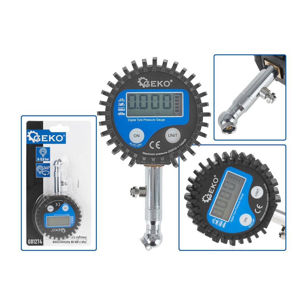 Αυτό το Ψηφιακό Μανόμετρο Για Έλεγχο Πίεσης Ελαστικών GEKO είναι εξοπλισμένο με οθόνη LCD με οπίσθιο φωτισμό και περιστρεφόμενη κεφαλή 360°, με γωνιακή μύτη 45° για εύκολη πρόσβαση. Μπορεί να μετρήσει την πίεση σε τέσσερις μονάδες: psi, kPa, bar και kg/cm², με ανάλυση 0,01 bar.