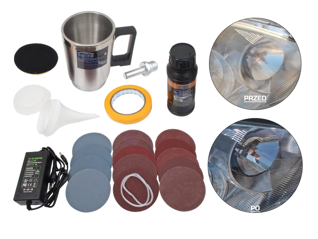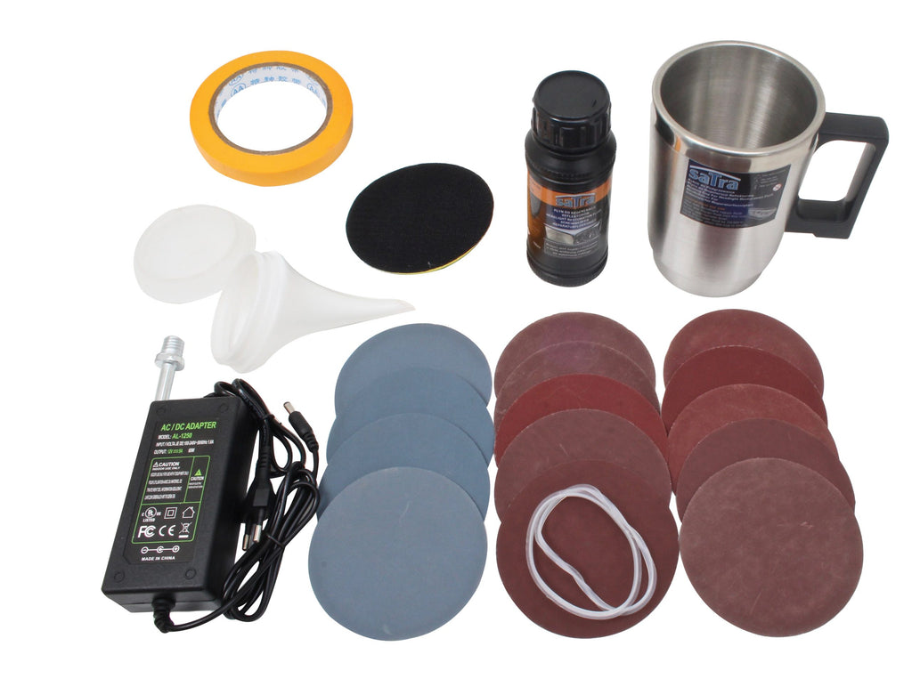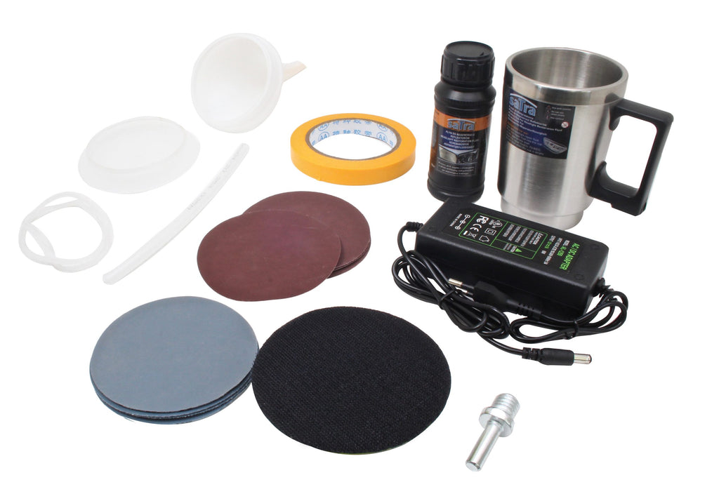 Το σετ περιλαμβάνει γυαλόχαρτα P800, P1000, P1200, P1500, P2000, P2500 και P3000 (δύο τεμάχια από κάθε τύπο), ένα φιαλίδιο 100 ml με υγρό αποκατάστασης, ένα κύπελλο εφαρμογής του υγρού, πλαστικό καπάκι για το κύπελλο, δύο φλάντζες για το κύπελλο, τροφοδοσία 230 V, σφουγγάρι γυαλίσματος με στερέωση velcro, αντάπτορα με σπείρωμα M10 και καπάκι για ποτήρι με εύκαμπτο σωλήνα.