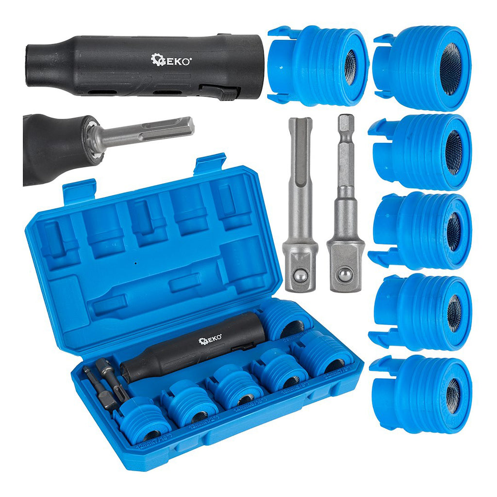 Το Σετ Επαγγελματικό Εργαλείων Καθαρισμού Βιδών Και Μπουλονιών Τροχού Αυτοκινήτου 9Τμχ GEKO έχει σχεδιαστεί για την αφαίρεση σκουριάς, βρωμιάς και λιπαρών καταλοίπων από τα σπειρώματα και τις επιφάνειες επαφής των αξόνων. Περιλαμβάνει βάση με βούρτσα με υποδοχή 1/2", έξι εναλλάξιμες βούρτσες με διάμετρο από 12 mm έως 28 mm, έναν αντάπτορα για κατσαβίδι με εξάγωνη υποδοχή 1/2" και έναν αντάπτορα για περιστροφικά σφυριά SDS-PLUS.