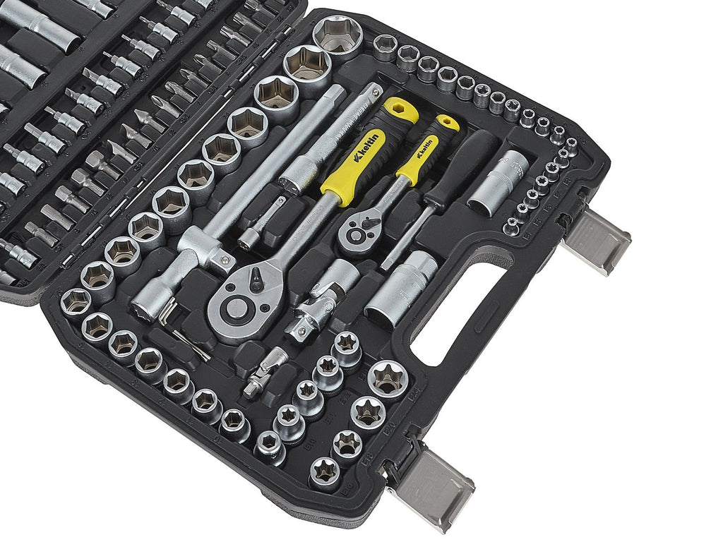 Το σετ περιλαμβάνει καρυδάκια 1/4” σε στάνταρ διαστάσεις από 4 έως 14 mm, τύπου E από E4 έως E8 και μακριά καρυδάκια από 6 έως 13 mm. Περιλαμβάνονται επίσης καρυδάκια 1/2” από 10 έως 32 mm, τύπου E από E10 έως E24 και μακριά από 14 έως 22 mm. Τα κλειδιά μπουζί 16 mm και 21 mm είναι ιδανικά για εργασίες σε οχήματα.