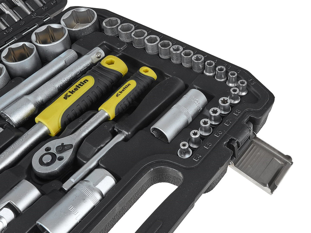 Το Σετ-Κιτ Εργαλείων 1/4" 1/2" 108Τμχ GEKO είναι κατάλληλο τόσο για επαγγελματική χρήση όσο και για οικιακές επισκευές και εργασίες συντήρησης. Τα εξαρτήματα είναι κατασκευασμένα από χρωμιοβαναδιούχο ατσάλι (CrV), το οποίο προσφέρει υψηλή μηχανική αντοχή και προστασία κατά της διάβρωσης. Το σετ περιλαμβάνει δύο καστάνιες – μία 1/4” και μία 1/2” – και οι δύο διαθέτουν εργονομικές, αντιολισθητικές λαβές για άνετη και ασφαλή χρήση.