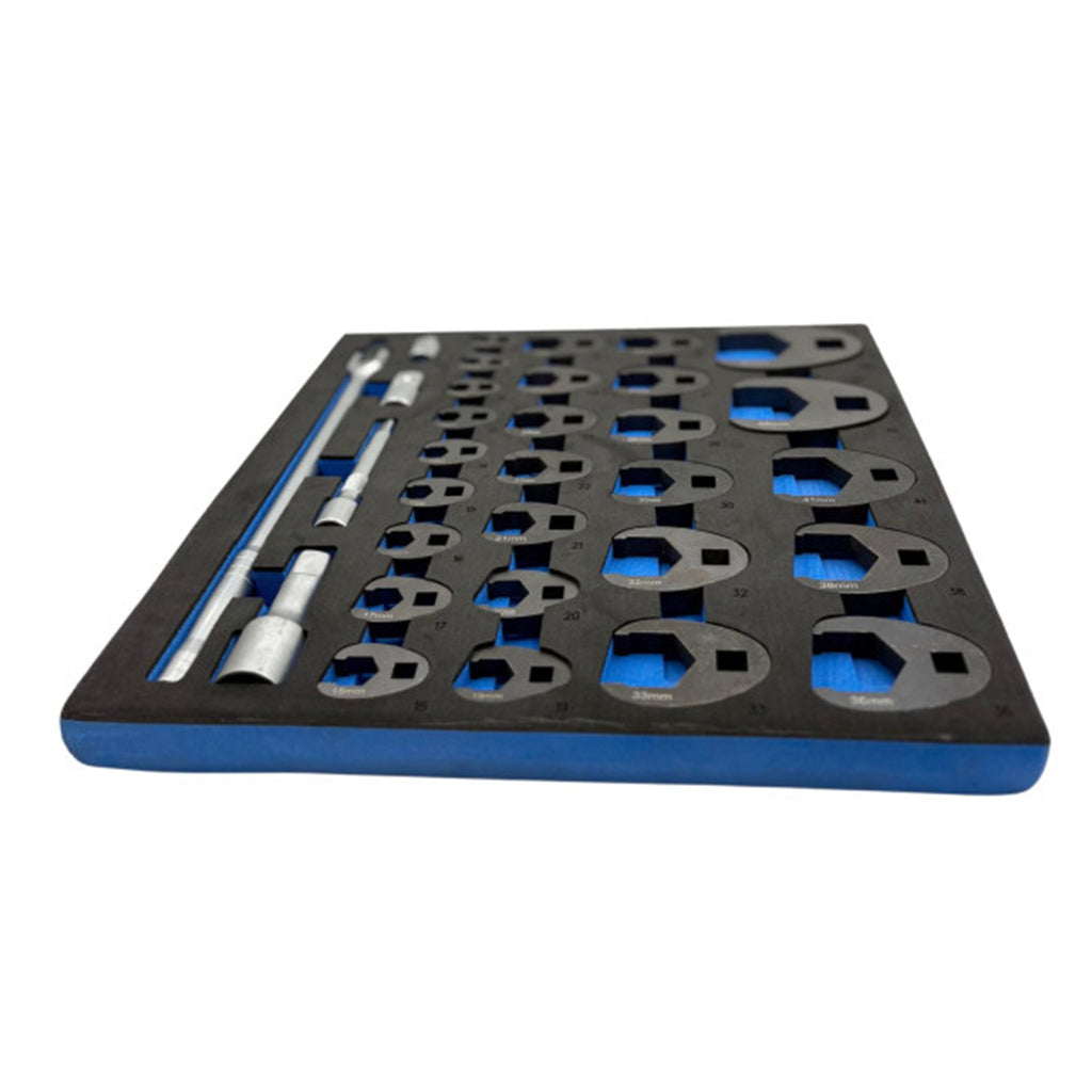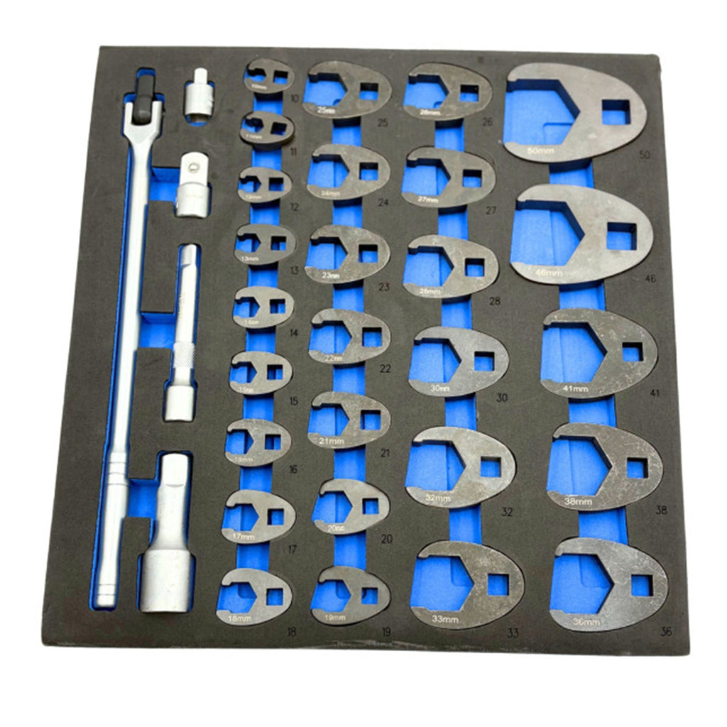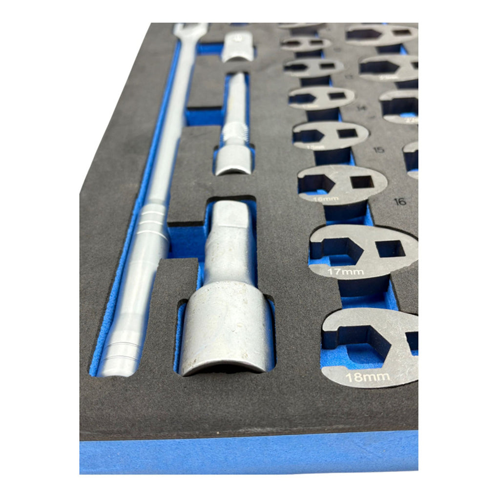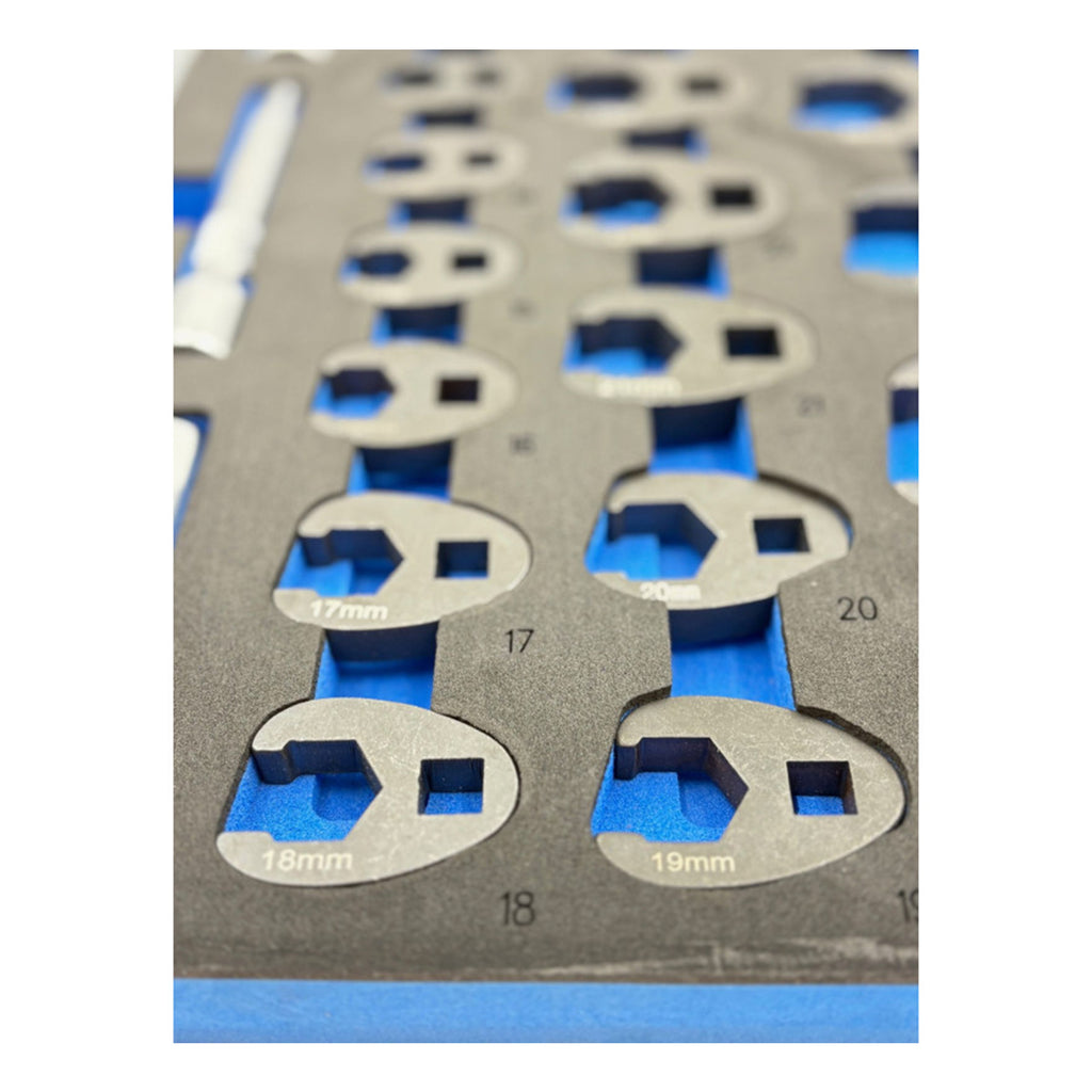 Το σετ περιλαμβάνει 32 κλειδιά ημίκλειστου τύπου με κεφαλή τύπου crow foot, οργανωμένα σε αφρώδες ένθετο, συμβατό με εργαλεία μετάδοσης 3/8”, 1/2” και 3/4”.
